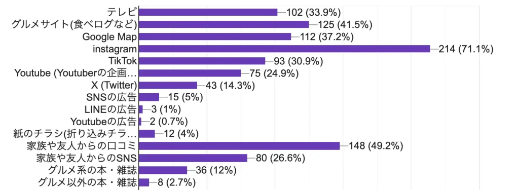 7割以上の人がInstagramから情報を集めており、Instagramが飲食店の認知拡大において重要な役割を果たしていることが分かりました。