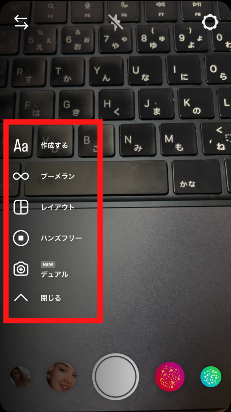 ストーリーズで撮影する際は、ストーリーズ作成画面左側の5種類の撮影モードから選べます。